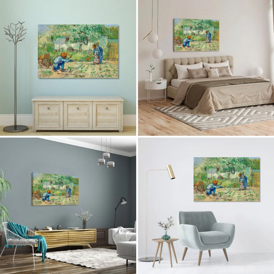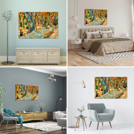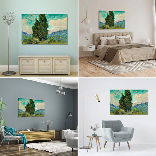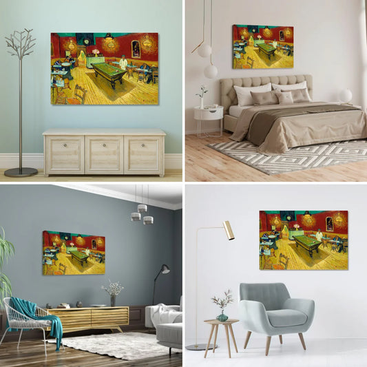 Cada cuadro de esta colección está impreso en canvas de alta calidad, con detalles que replican fielmente las pinceladas originales de Van Gogh. Montados sobre bastidores de madera maciza de pino, estas reproducciones están listas para colgar y disfrutar.