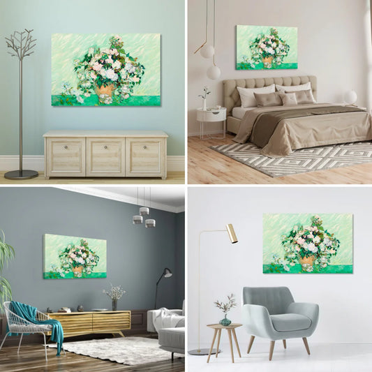 Creado en 1890, Rosas es un cuadro que refleja la delicadeza de estas flores en tonos suaves de verde y blanco. Pintado durante sus últimos días en el asilo de Saint-Rémy, esta obra transmite serenidad y esperanza.