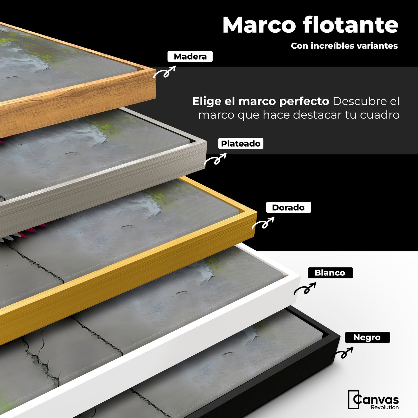 Personaliza aún más tu cuadro con un marco flotante disponible en madera, dorado, plateado, negro o blanco.