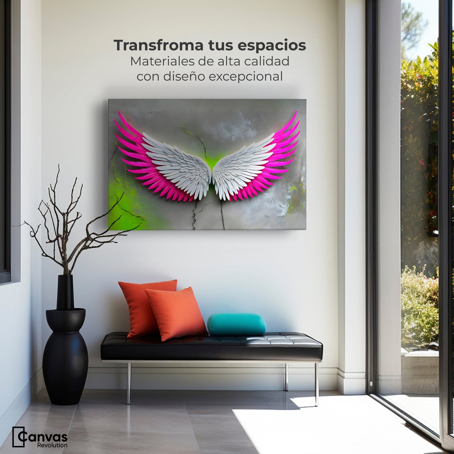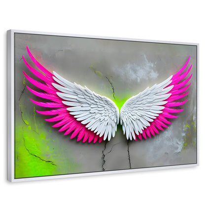 El cuadro decorativo Alas Vuelo Intenso es una pieza de arte vibrante y llena de energía. Sus imponentes alas blancas con un llamativo degradado rosa fucsia parecen flotar sobre un fondo gris texturizado, con toques de verde neón que resaltan su intensidad. Esta obra forma parte de nuestra colección Cuadros de Alas de Ángel, diseñada para quienes buscan una combinación de fuerza y belleza en su decoración en México.