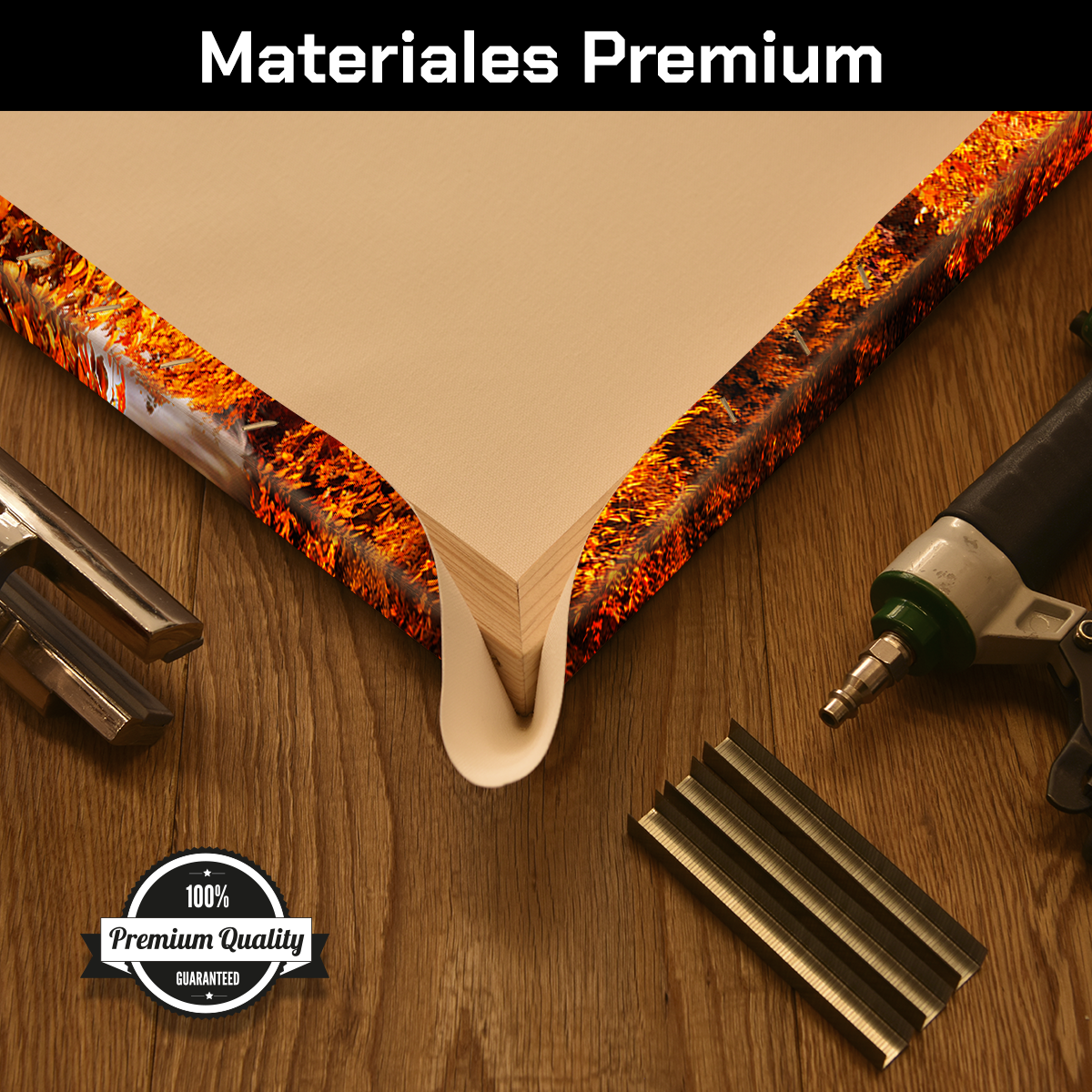 El cuadro está impreso en lienzo (canvas) premium, garantizando una reproducción fiel de los colores cálidos y los detalles del paisaje. La textura artística del lienzo realza la nitidez del agua y la profundidad de los tonos otoñales, ofreciendo un acabado profesional y duradero.