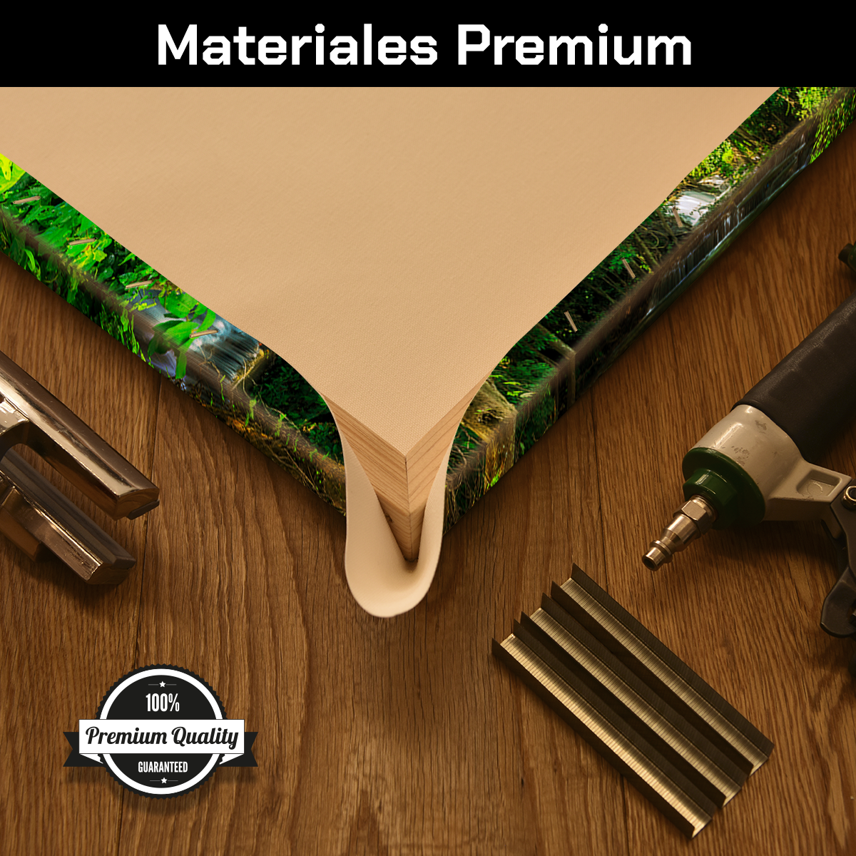El cuadro está elaborado sobre lienzo (canvas) premium, lo que garantiza colores vivos y detalles precisos. La textura del lienzo realza el movimiento del agua y la riqueza de los verdes, creando un acabado artístico que aporta profundidad y realismo.