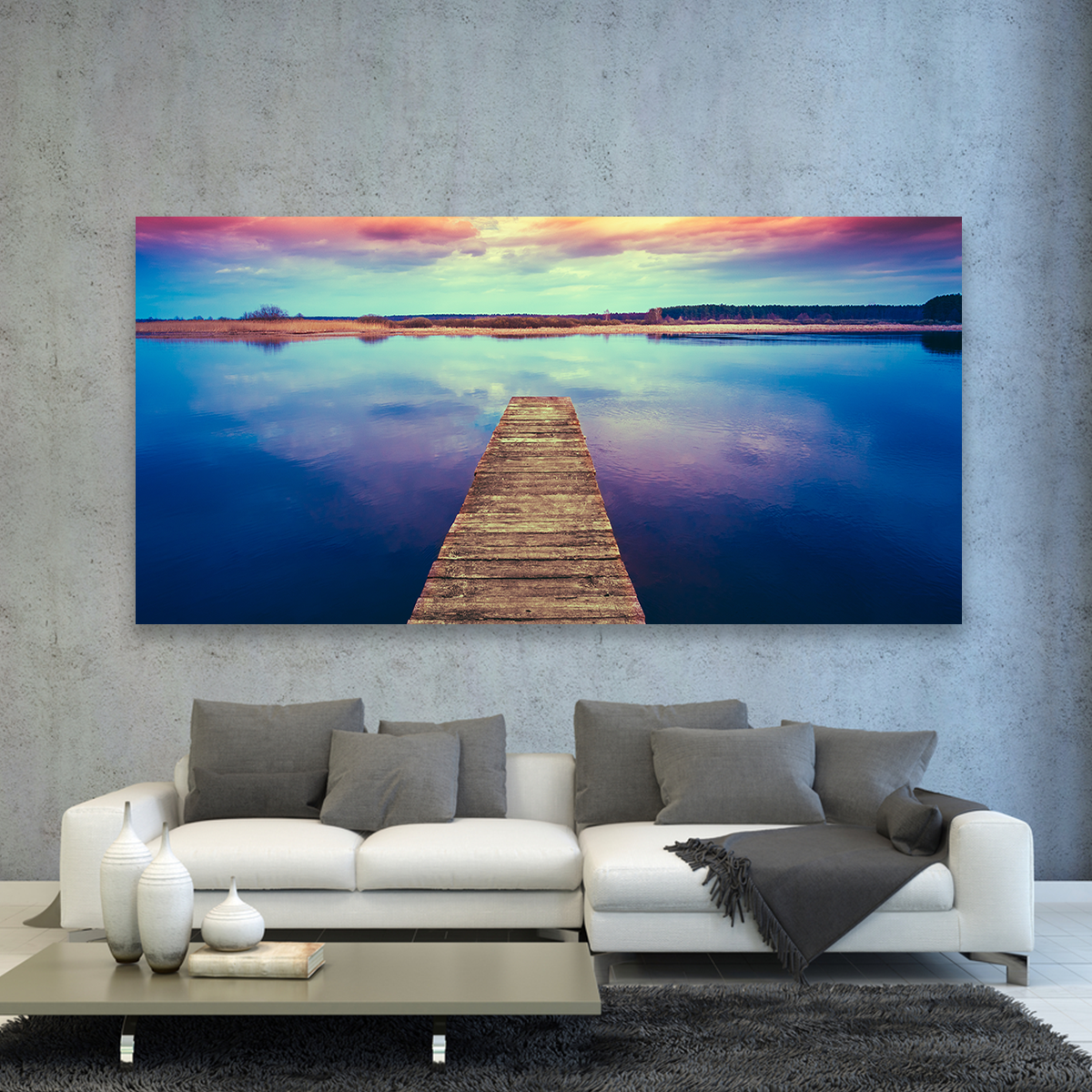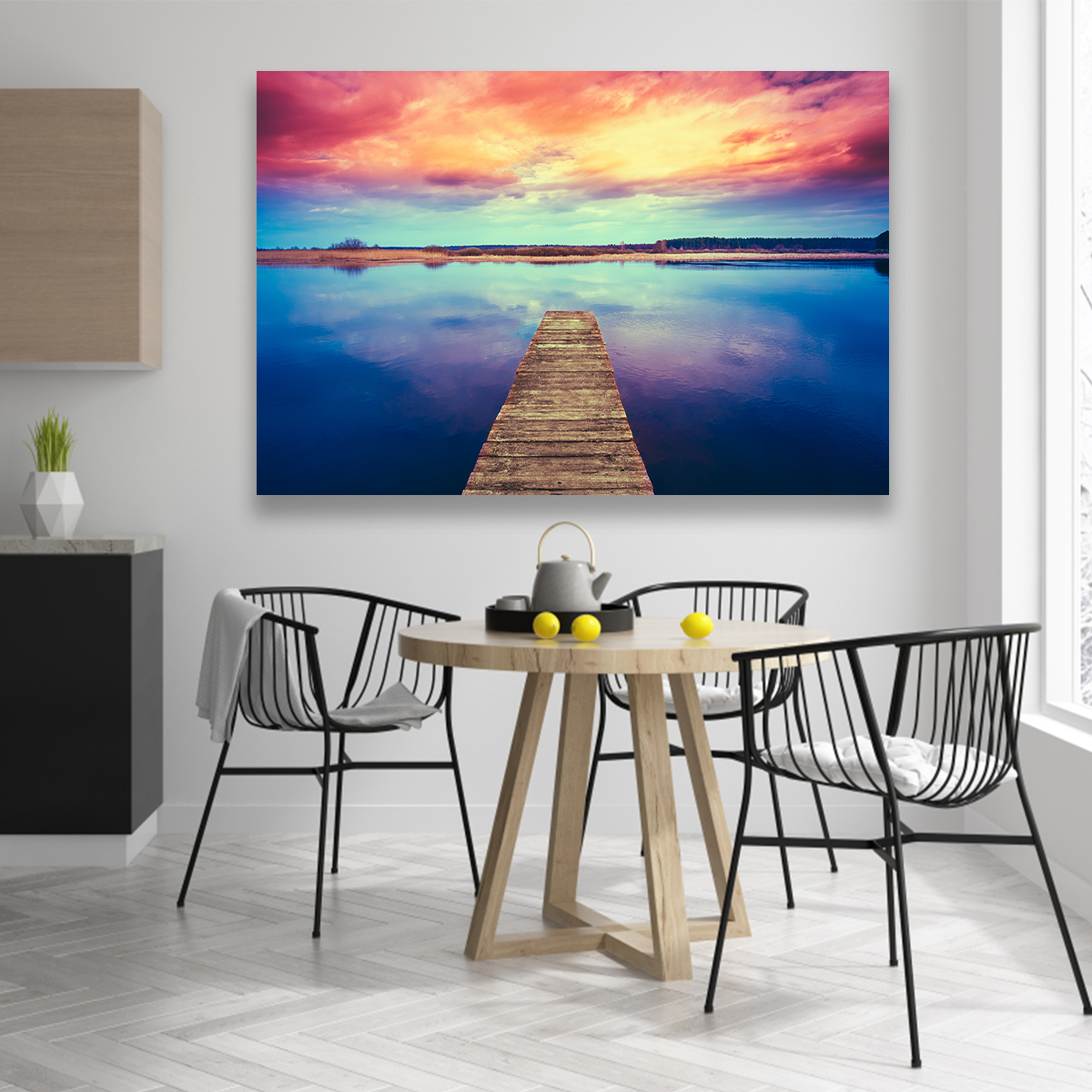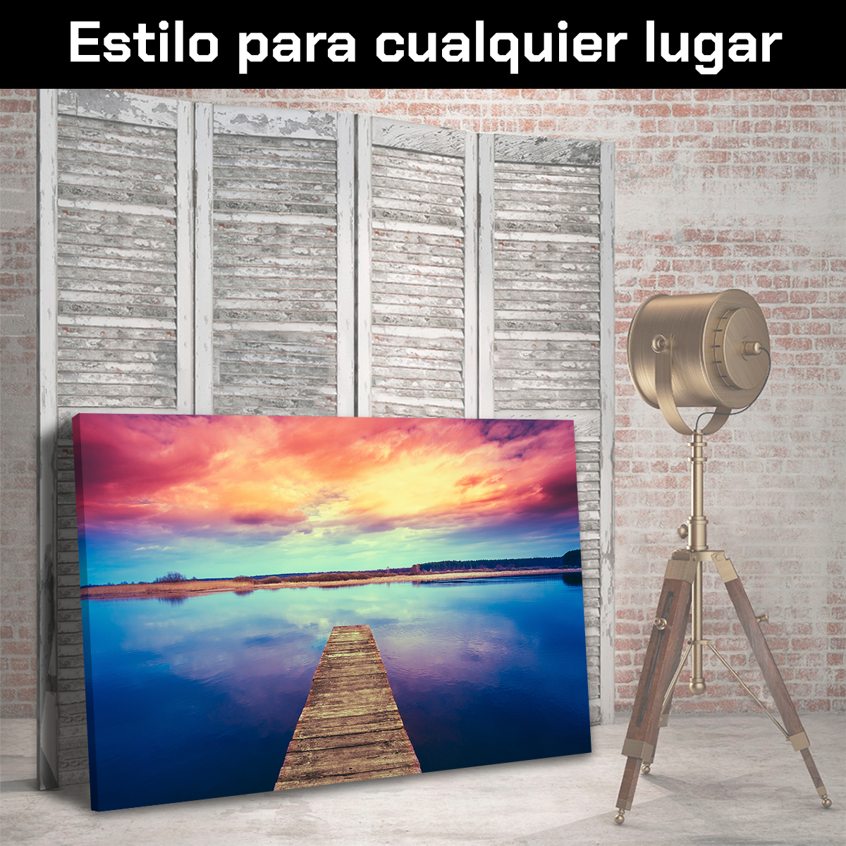 Un muelle de madera se adentra en aguas tranquilas que reflejan un cielo vibrante lleno de tonos cálidos y nubes dramáticas al atardecer. Este lienzo premium transmite calma y majestuosidad, ideal para transformar cualquier espacio en un refugio visual.