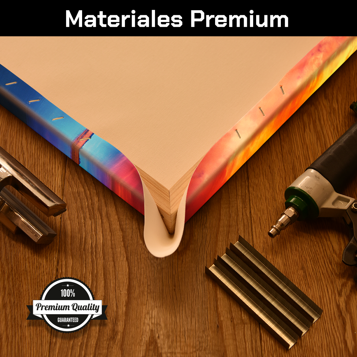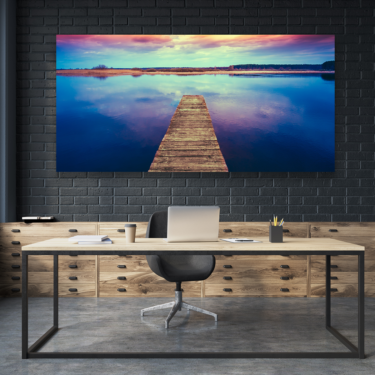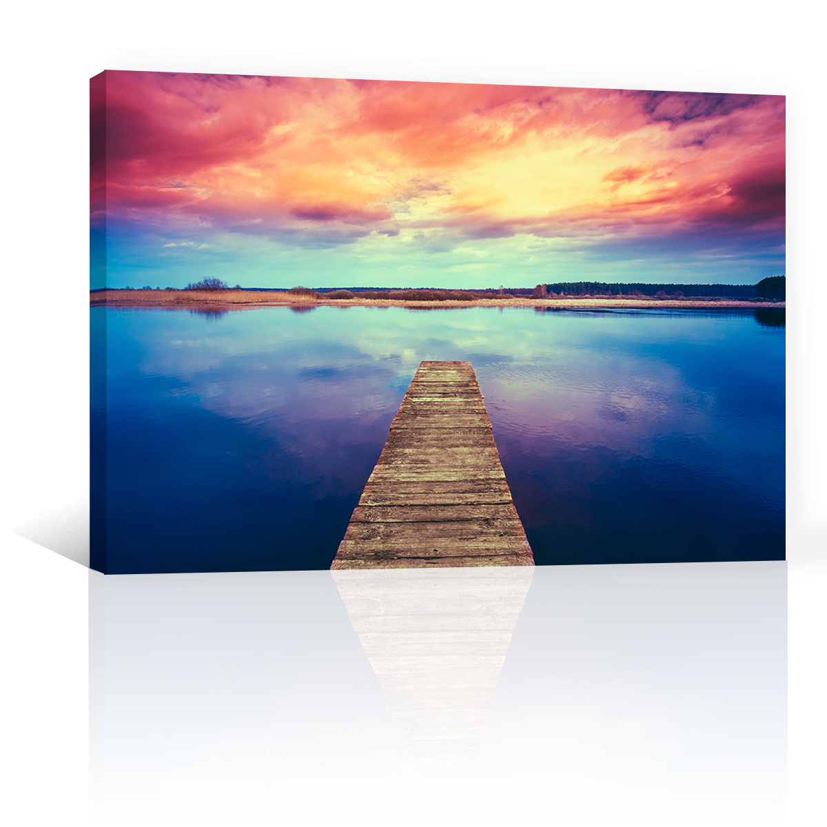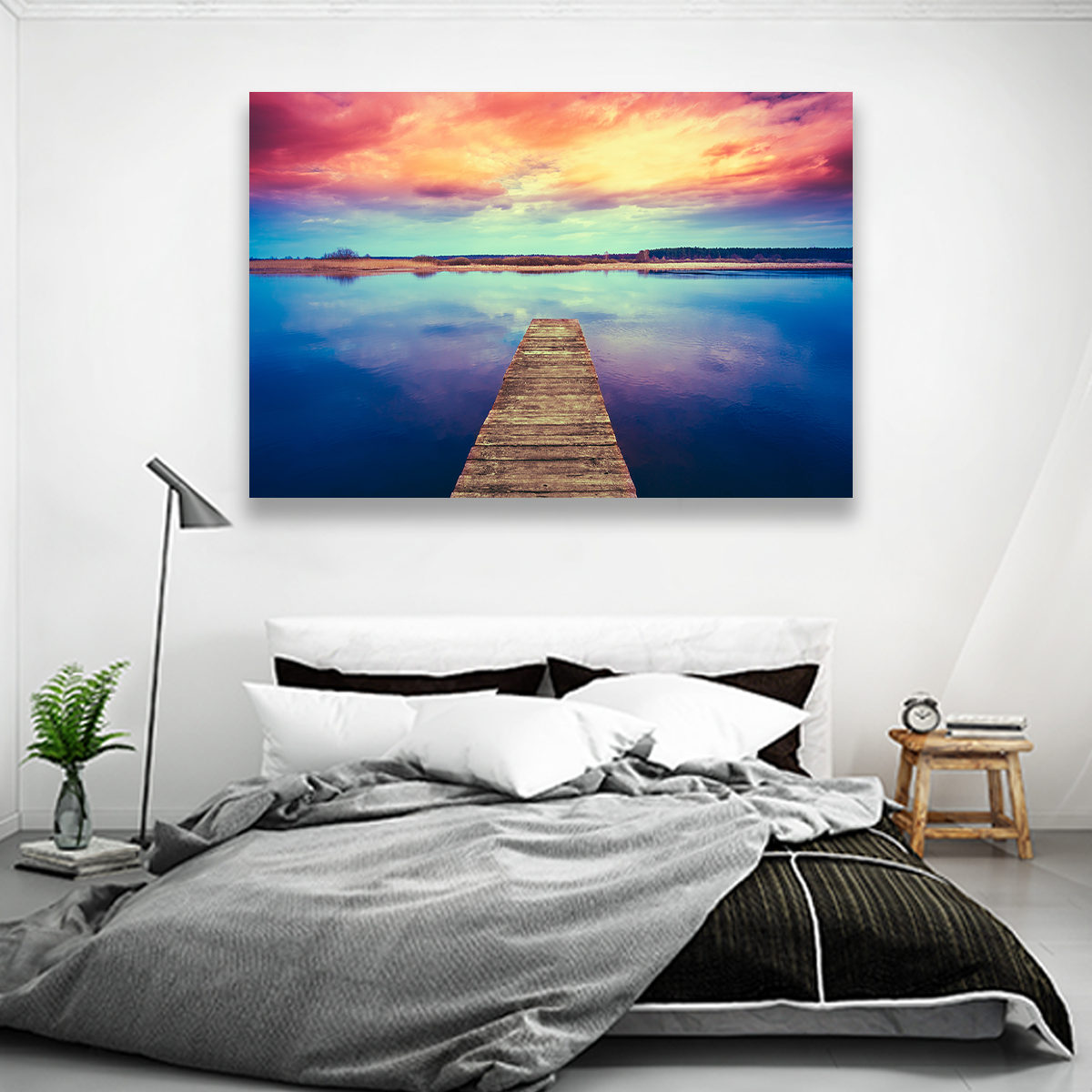 Un muelle de madera se adentra en aguas tranquilas que reflejan un cielo vibrante lleno de tonos cálidos y nubes dramáticas al atardecer. Este lienzo premium transmite calma y majestuosidad, ideal para transformar cualquier espacio en un refugio visual.