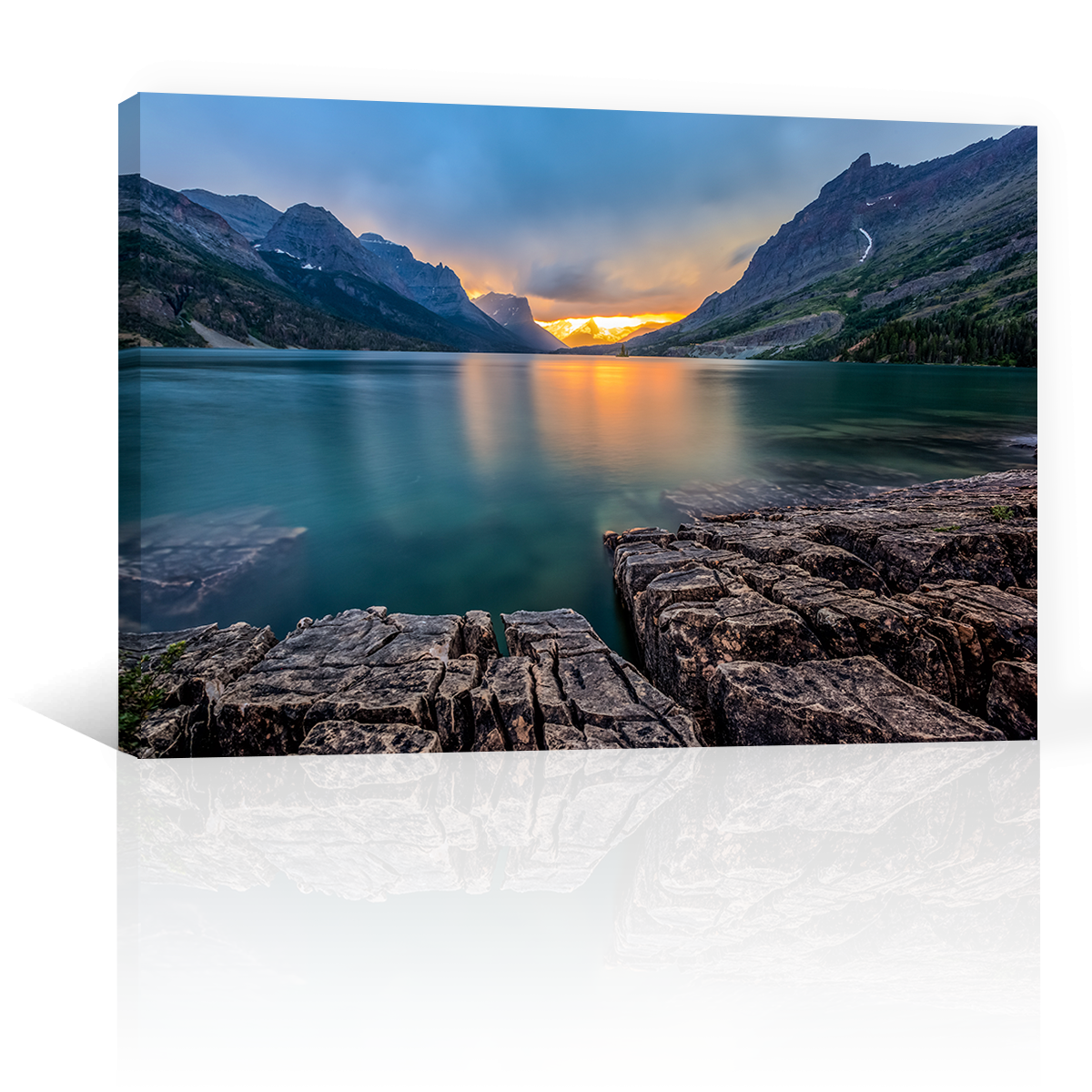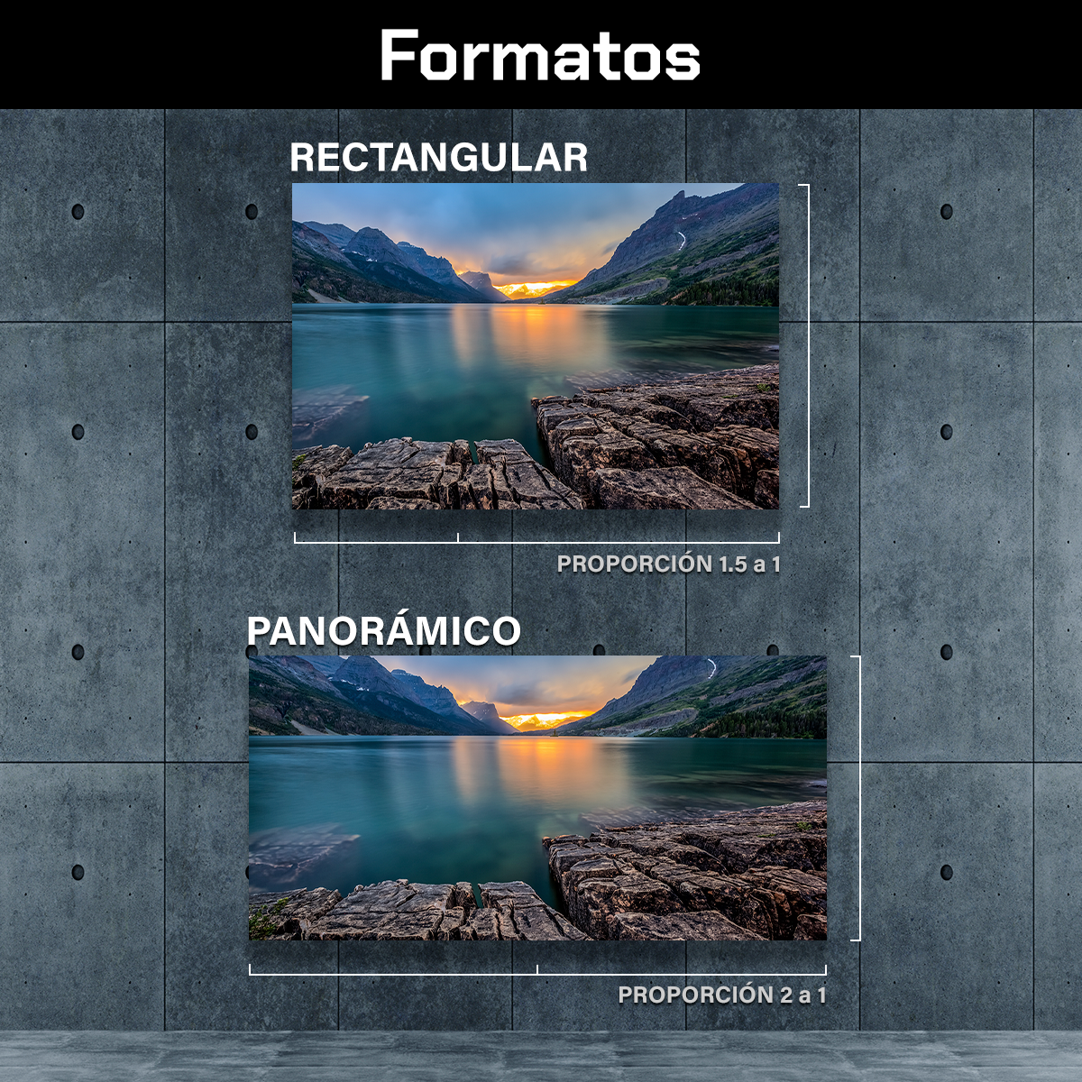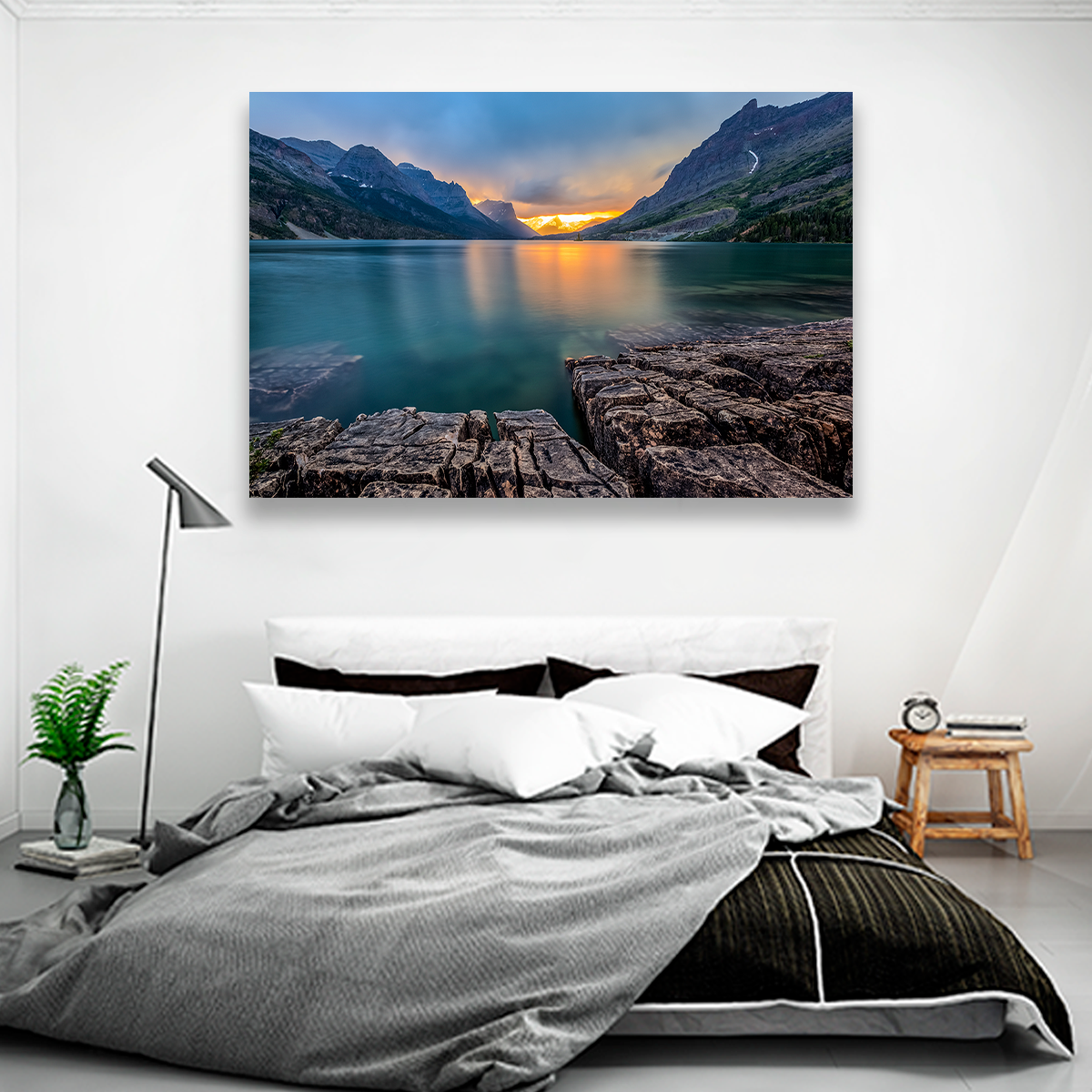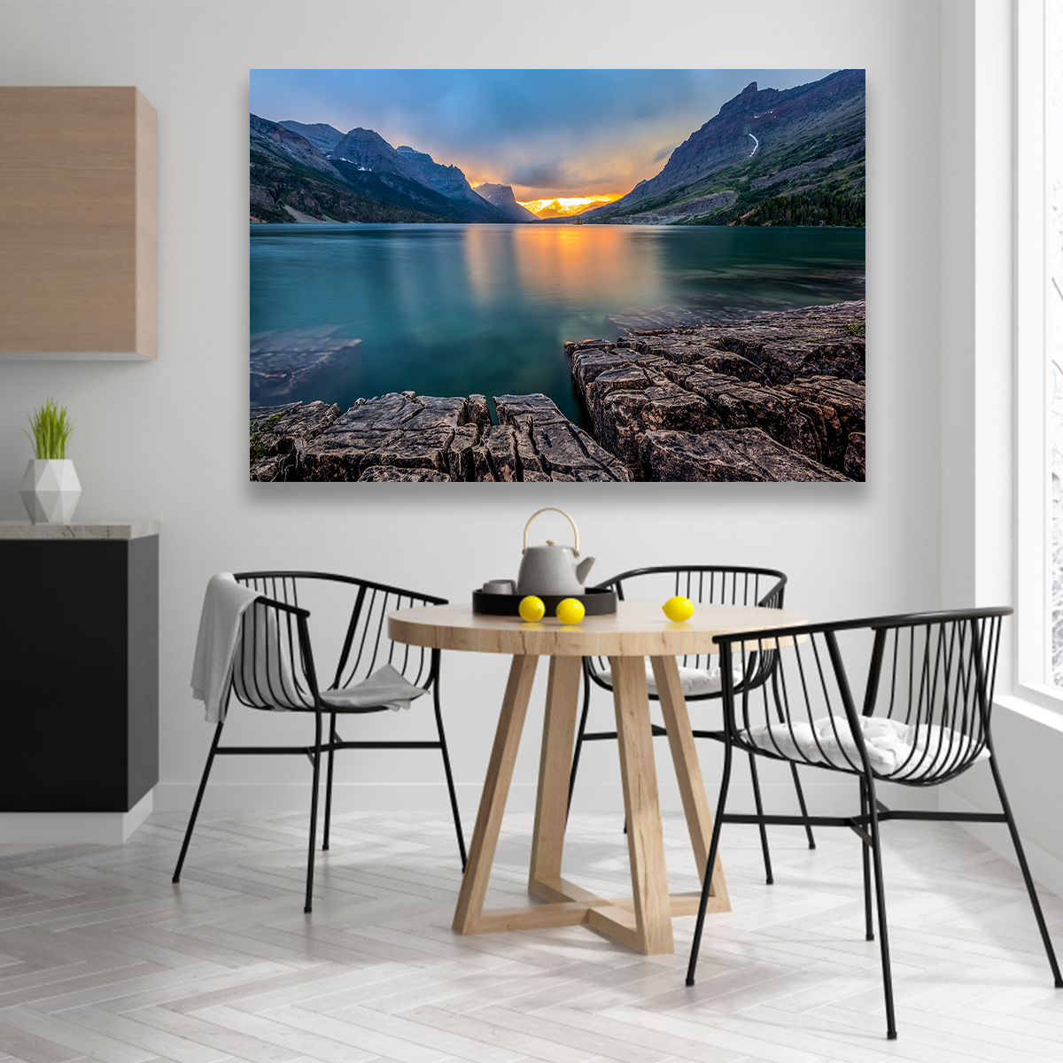 "Lago Mary Atardecer" está disponible en diversos tamaños y con la posibilidad de personalizarlo con un marco flotante en colores como blanco, negro, madera, dorado o plateado. Estas opciones aseguran que el cuadro se adapte a cualquier estilo decorativo, desde lo moderno hasta lo rústico.