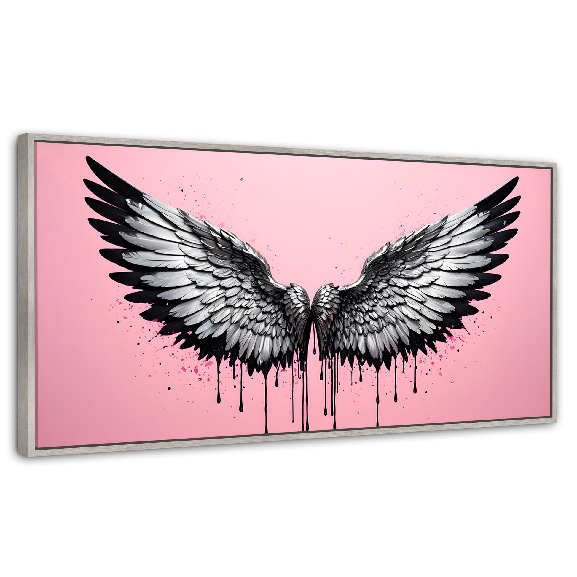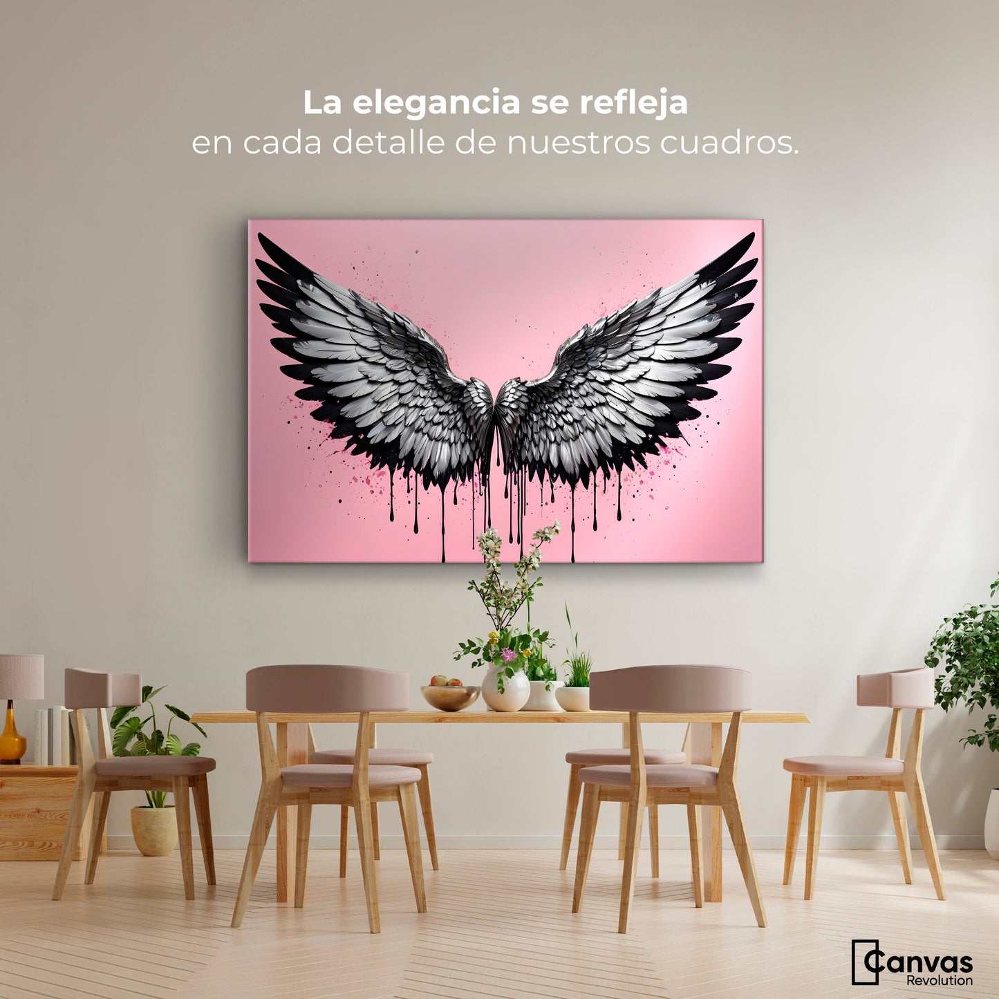 El cuadro decorativo Luz de Ángeles es una obra cautivadora que combina elegancia y modernidad en una pieza única. Presenta un par de majestuosas alas en tonos plateado y negro con un efecto de pintura goteante, resaltando sobre un fondo rosa suave que aporta equilibrio y serenidad. Las salpicaduras sutiles de color complementan su estilo urbano y contemporáneo. Este cuadro pertenece a la colección Cuadros de Alas de Ángel, una serie de piezas diseñadas para inspirar luz y energía. Disponible en México, es ideal para quienes buscan arte con un toque moderno y sofisticado.