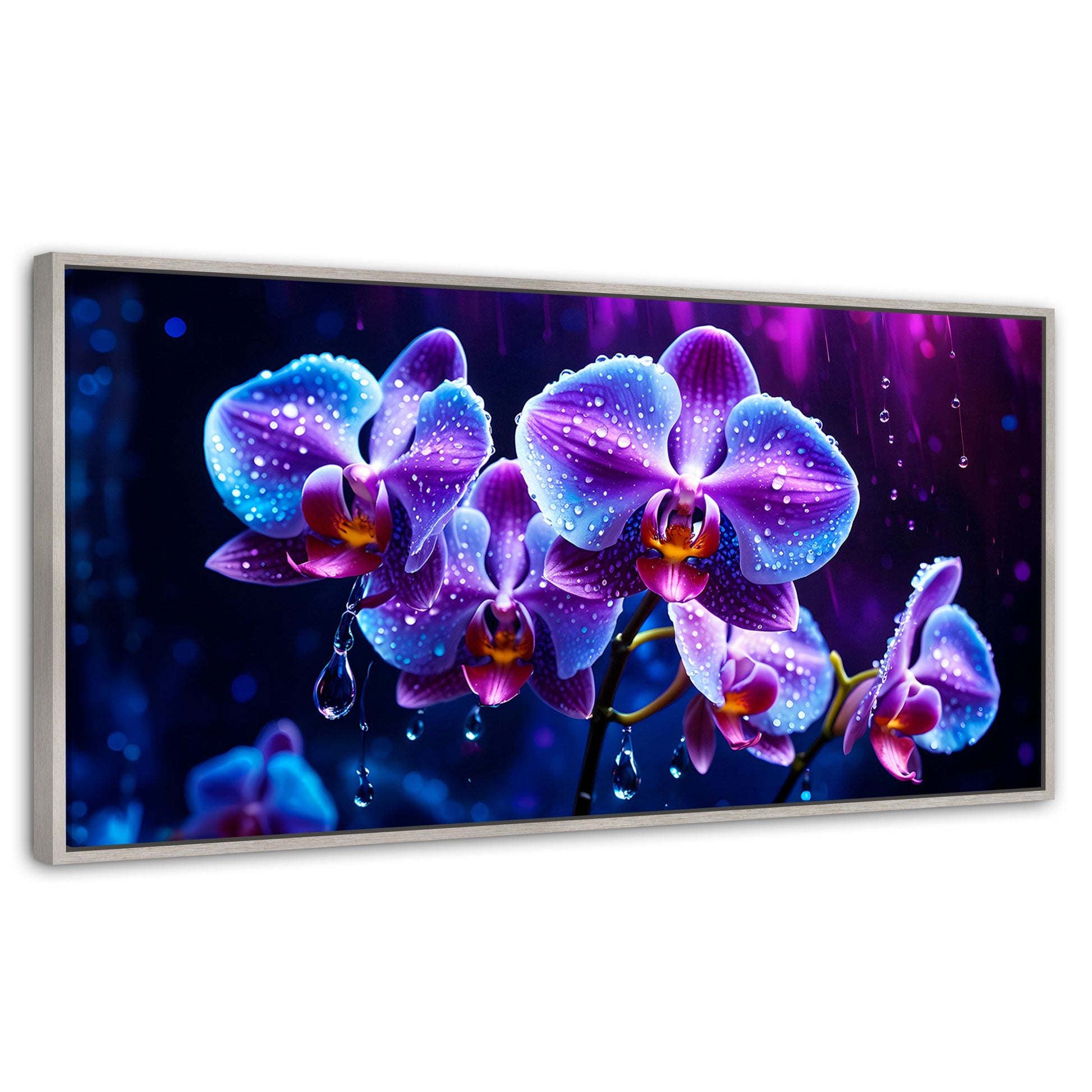 Este cuadro decorativo resalta la belleza delicada de las orquídeas en tonos púrpura y azul, adornadas con gotas de agua que brillan sutilmente bajo una iluminación suave. El contraste con el fondo oscuro crea un efecto visual impactante y lleno de serenidad. Este cuadro pertenece a la colección Cuadros de Flores, ideal para embellecer espacios en México.